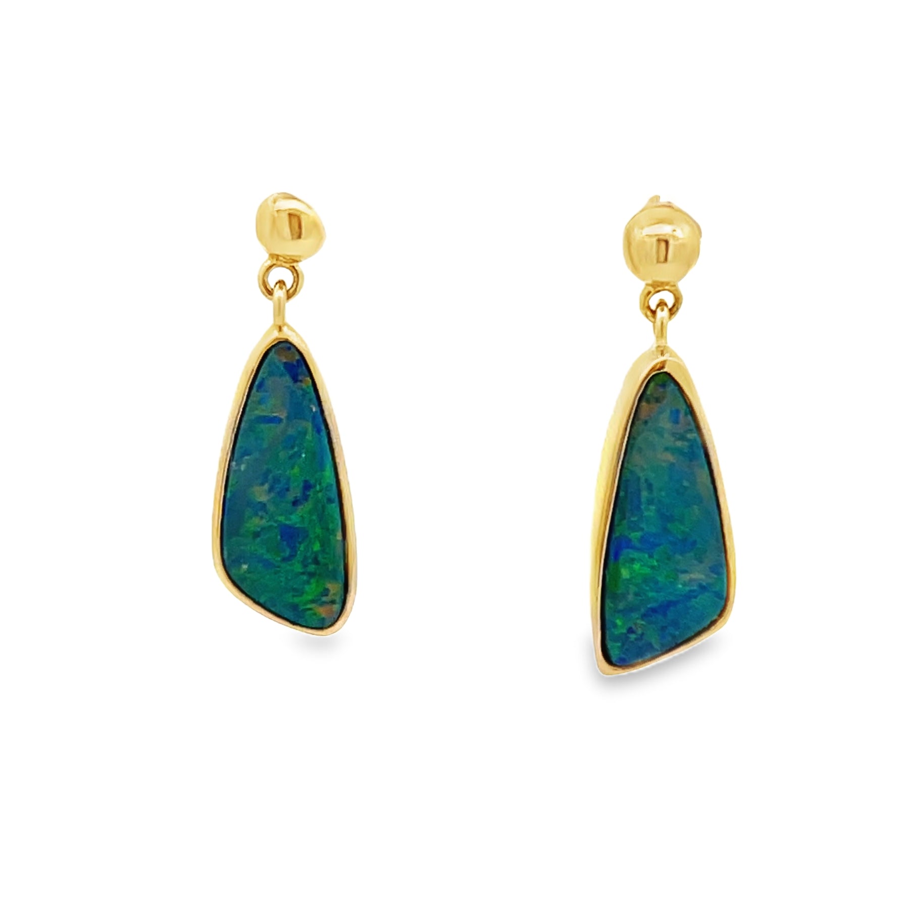 Regular price $1,650.00 Save $-1,650.00The 14k yellow gold opal doublet earrings are a bezel set style that each feature one triangular shape opal doublet.