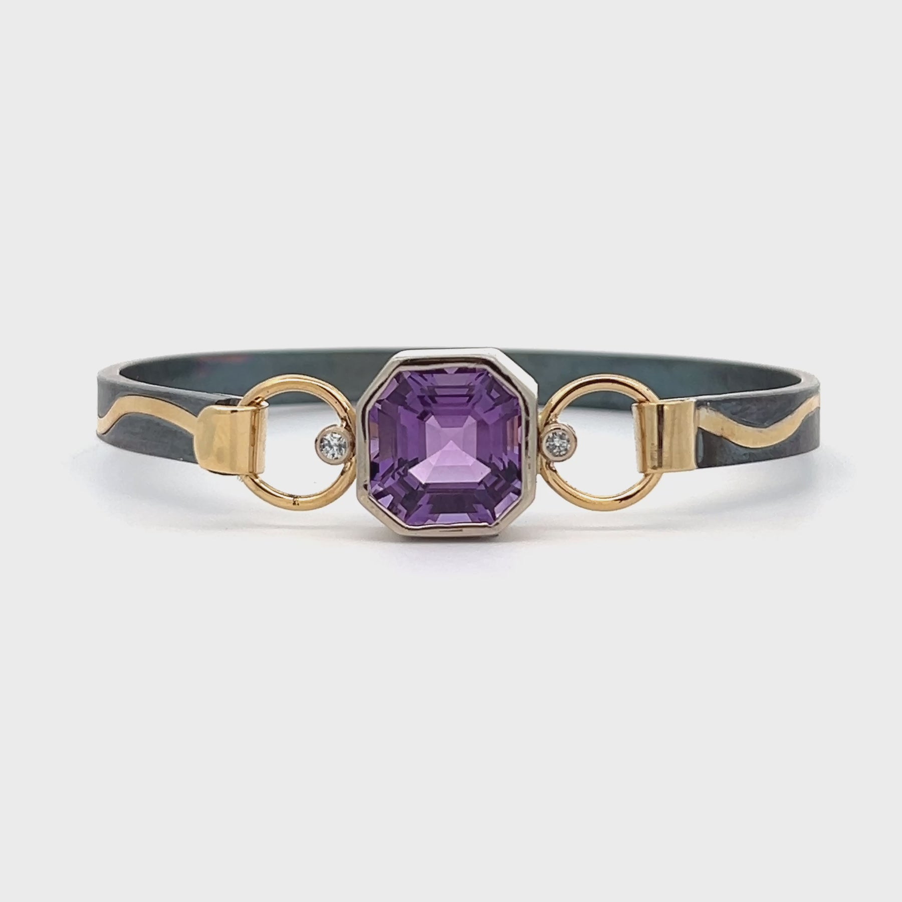 The oxidized sterling silver and two tone gold amethyst and diamond bracelet is an original design and hand fabrication by Paul Richter, created as part of the Pathways Collection.