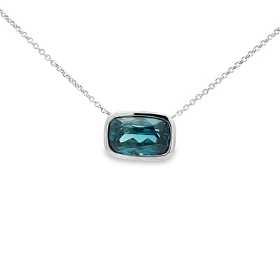 18k White Gold Pear Shape Blue Zircon and Round Diamond Bezel Set Pendant (3.43ct.)