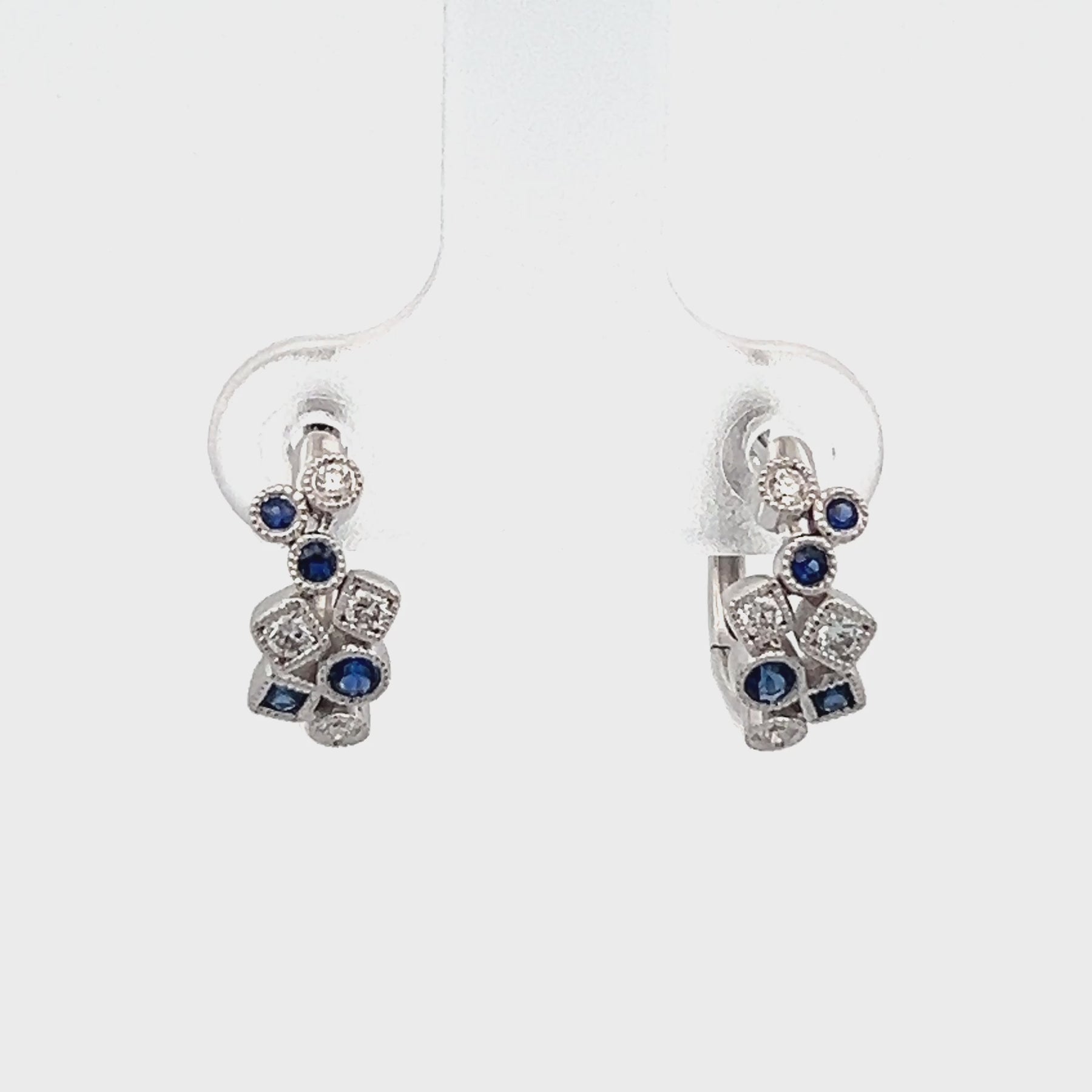 The 14k white gold sapphire and diamond are a huggie hoop style that are each bezel set with four graduated round brilliant cut sapphires and four graduated round brilliant cut diamonds.