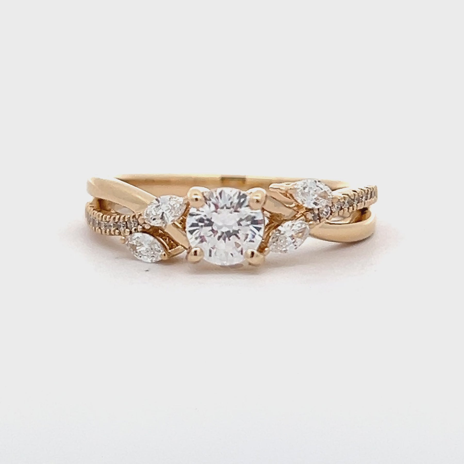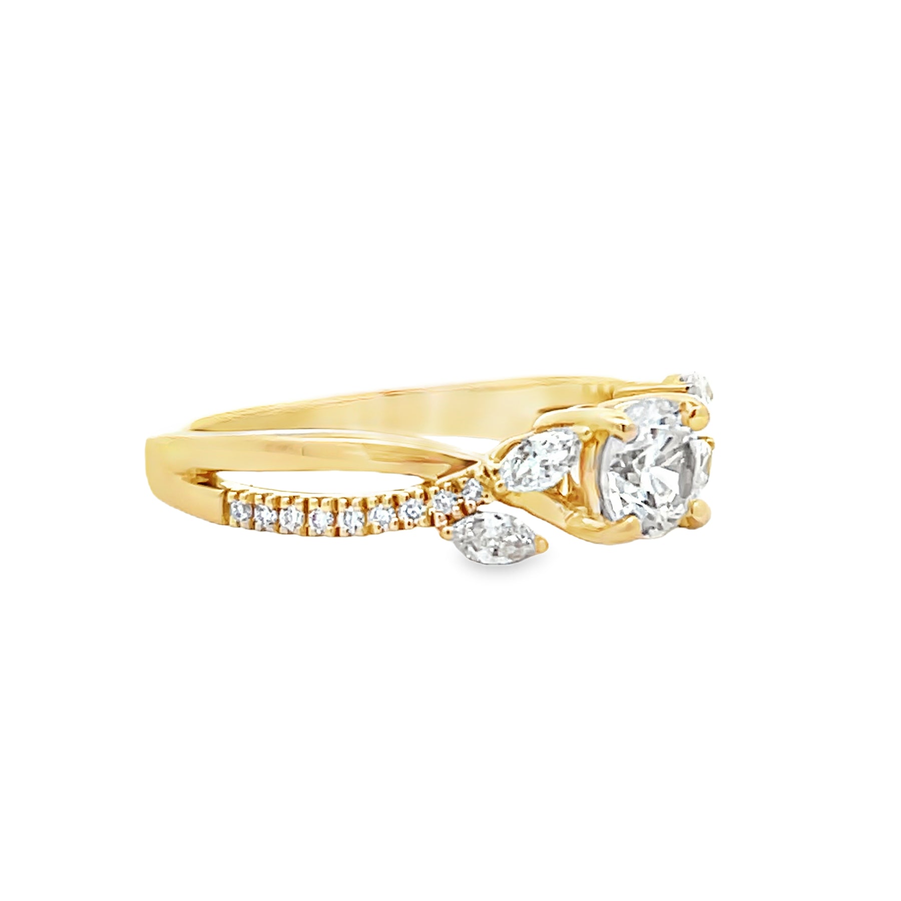 The 14k yellow gold diamond engagement ring setting is a nature inspired style with a twist split shank that  features two marquise cut diamonds on each side of the four prong center head and nine round brilliant cut diamonds on each shoulder.