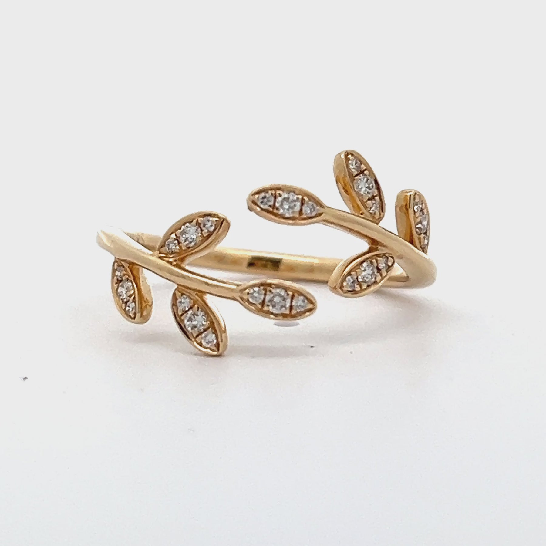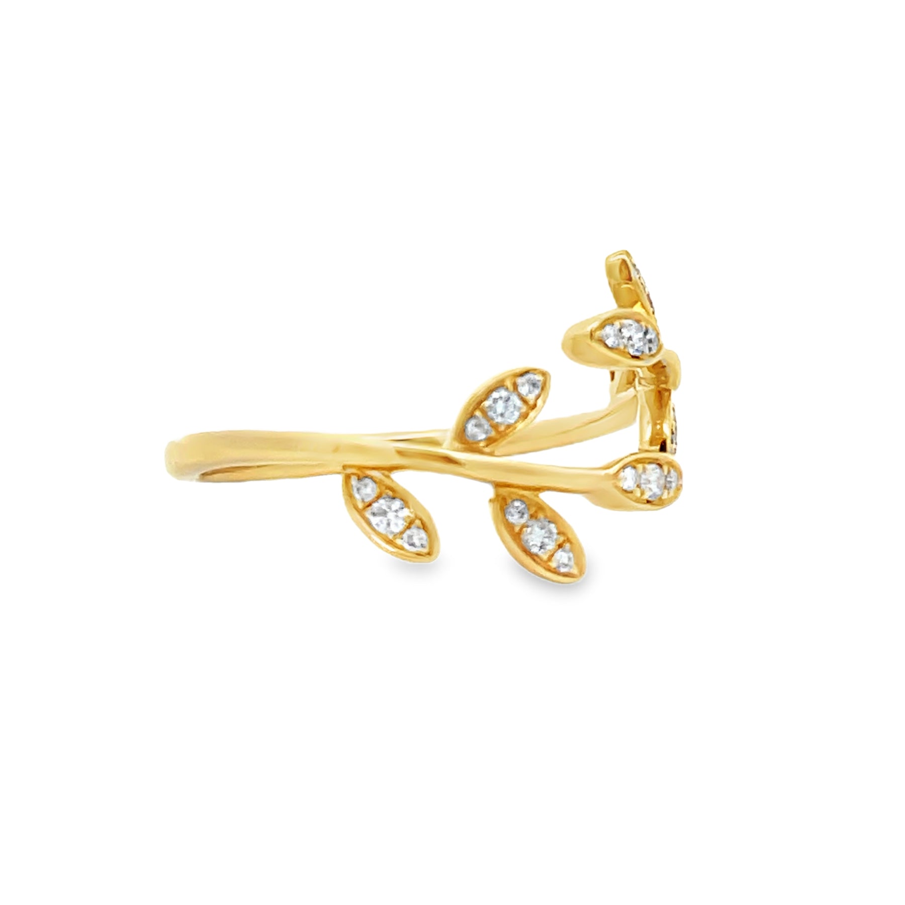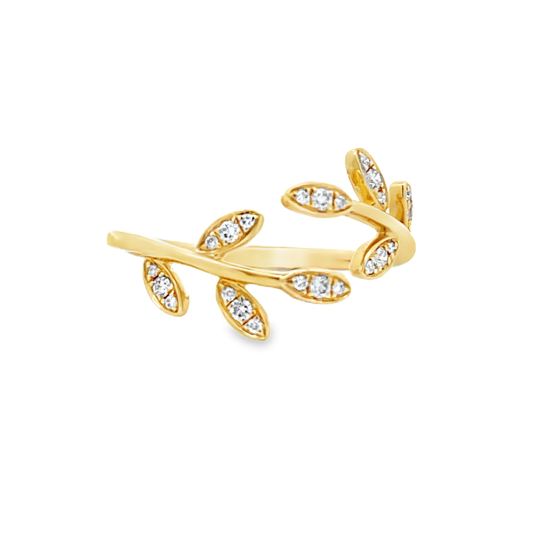 Regular price $1,299.00 Save $-1,299.00The 14k yellow gold diamond anniversary band is a nature inspired bypass leaf design that features eight leaves, each set with one larger and two smaller round brilliant cut diamonds.