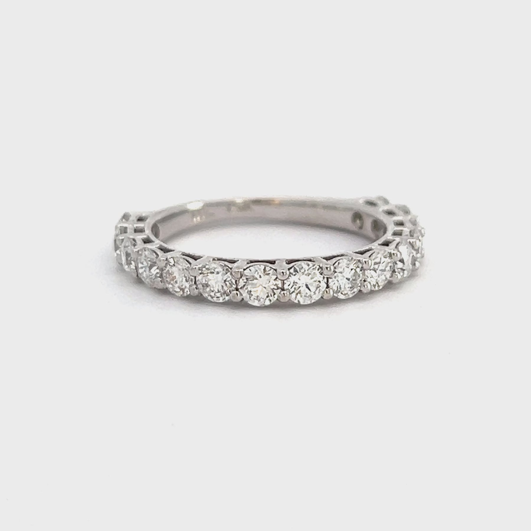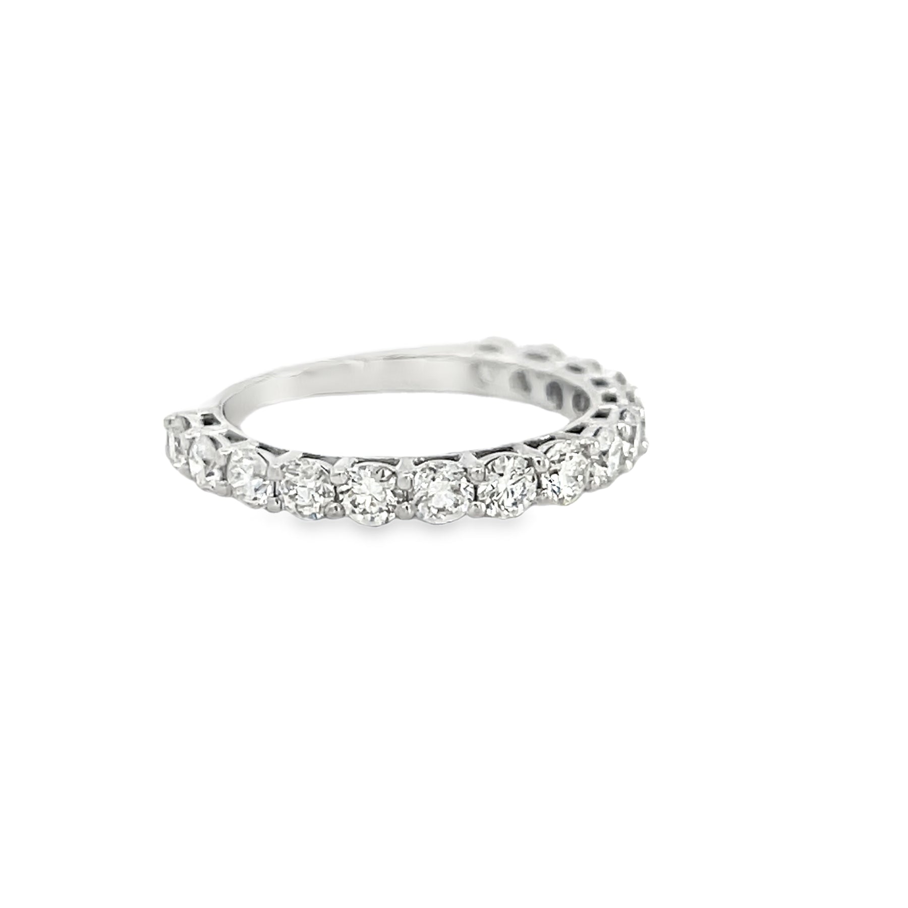 Regular price $3,299.00 Save $-3,299.00The 14k white gold diamond anniversary band is a shared prong style that features fifteen round brilliant cut 2.85mm diamonds.