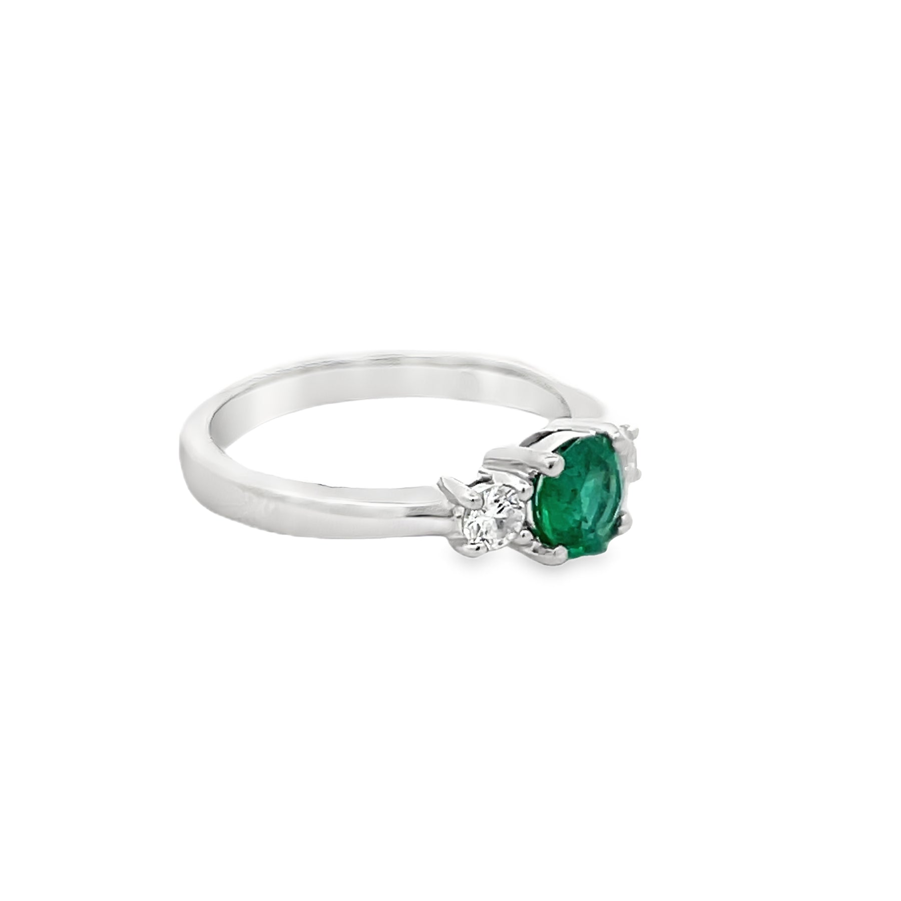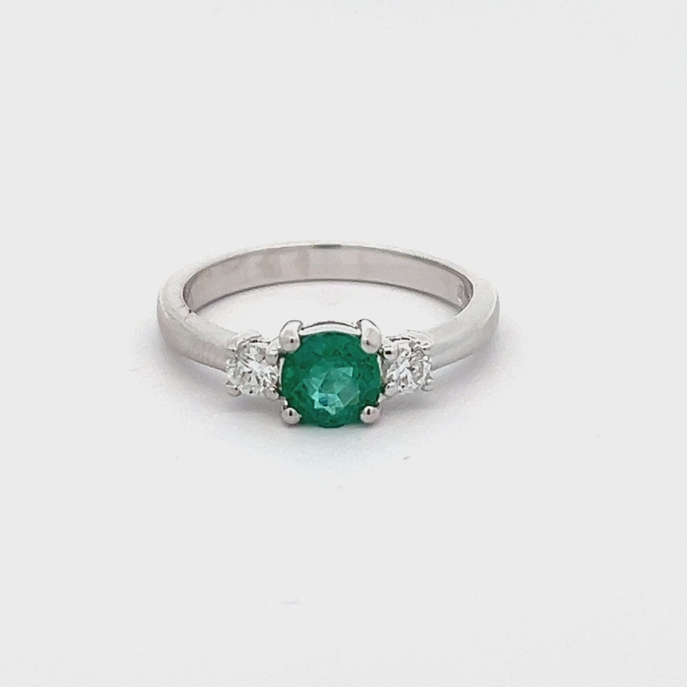 The ring is a prong set three stone style that features one round Zambian emerald accented bny two round brilliant cut diamonds.