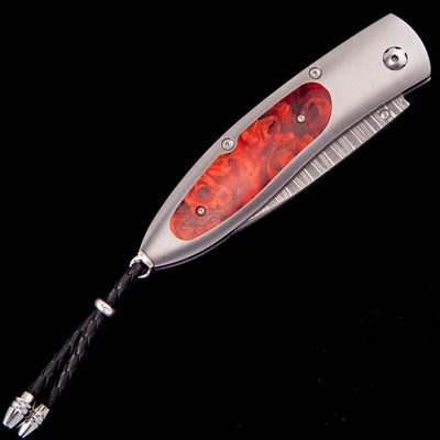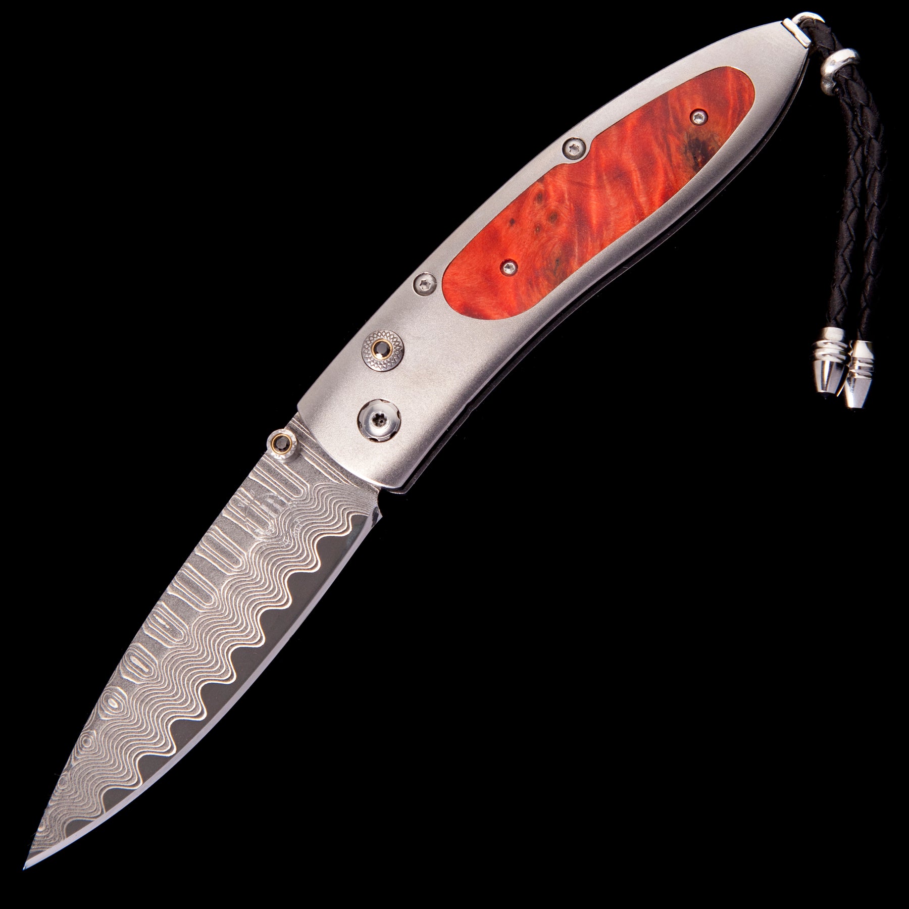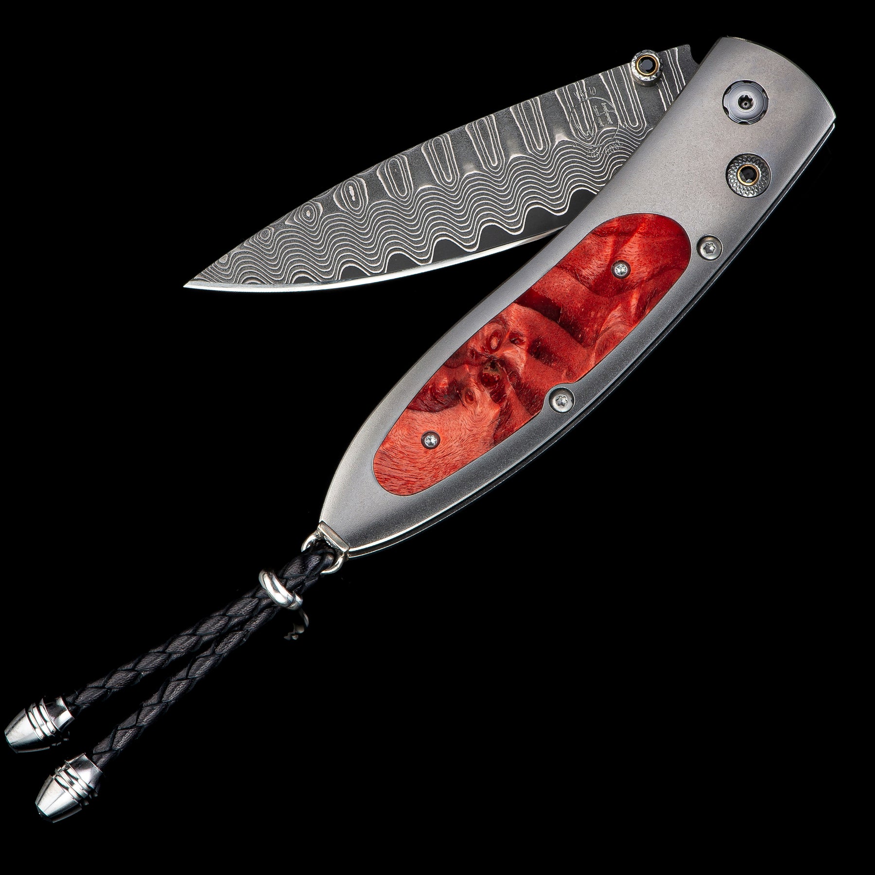 The Monarch 'Red Burl' pocketknife from William Henry Studio features an aerospace grade titanium frame inlaid with dyed poplar burl scales.